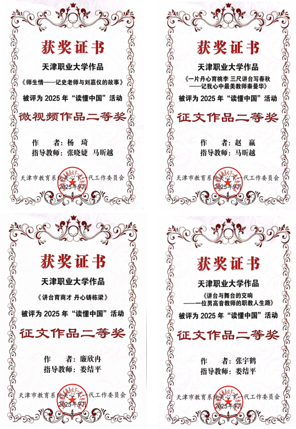 近日,天津市教育系统关工委下发了《关于公布了2025年“读懂中国”优秀作品评审结果的通知》,我校关工委报送的作品均获得二等奖,取得历史最好成绩。