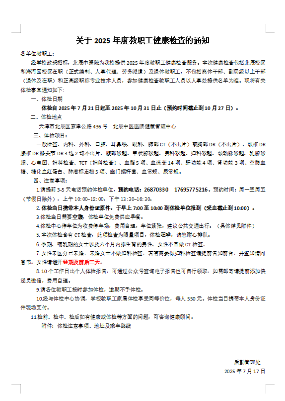 关于2025年度教职工健康检查的通知