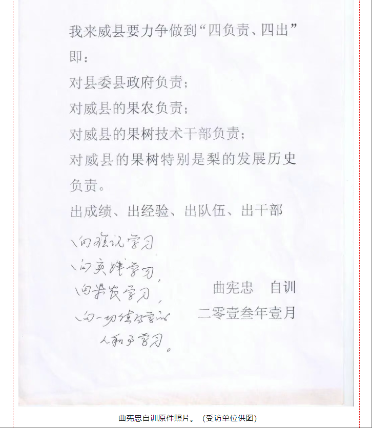工作人员在整理曲宪忠的遗物时,发现了一则“自训”:“我来威县要力争做到‘四负责、四出’:对县委县政府负责;对威县的果农负责;对威县的果树技术干部负责;对威县的果树特别是梨的发展历史负责。出成绩、出经验、出队伍、出干部。”