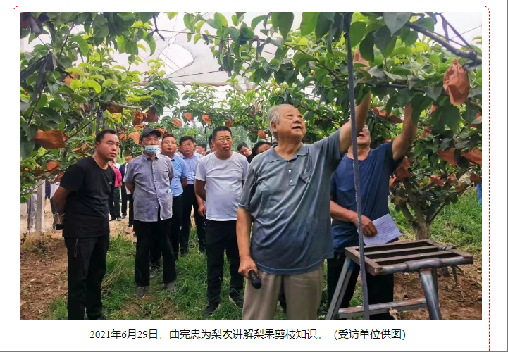 威县贺营镇袁家庄村是曲宪忠开展梨产业规模化种植的第一个试点村。“曲老师每天早晨准时出现在田间地头,手把手教梨农剪枝、疏果、除虫,大家对他的技术和作风心服口服。”袁家庄村党支部原书记郑继奎回忆。